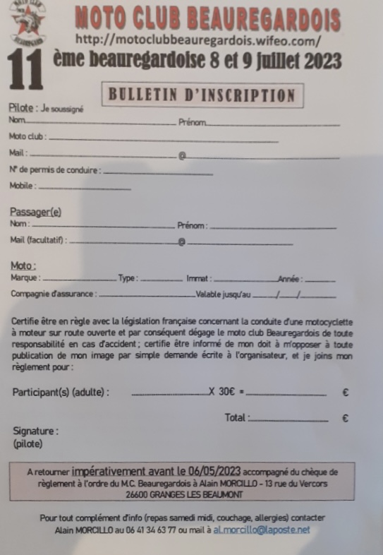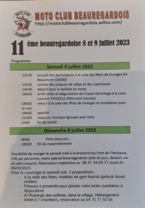 Bonjour je suis le co président du club Moto MCB de beauregard Baret et je vous annonce que les caillettes qui été prévu le 21 juin est reporté et la beauregardoise qui était prévu le week-end du 18 et 19 juillet est annulé merci